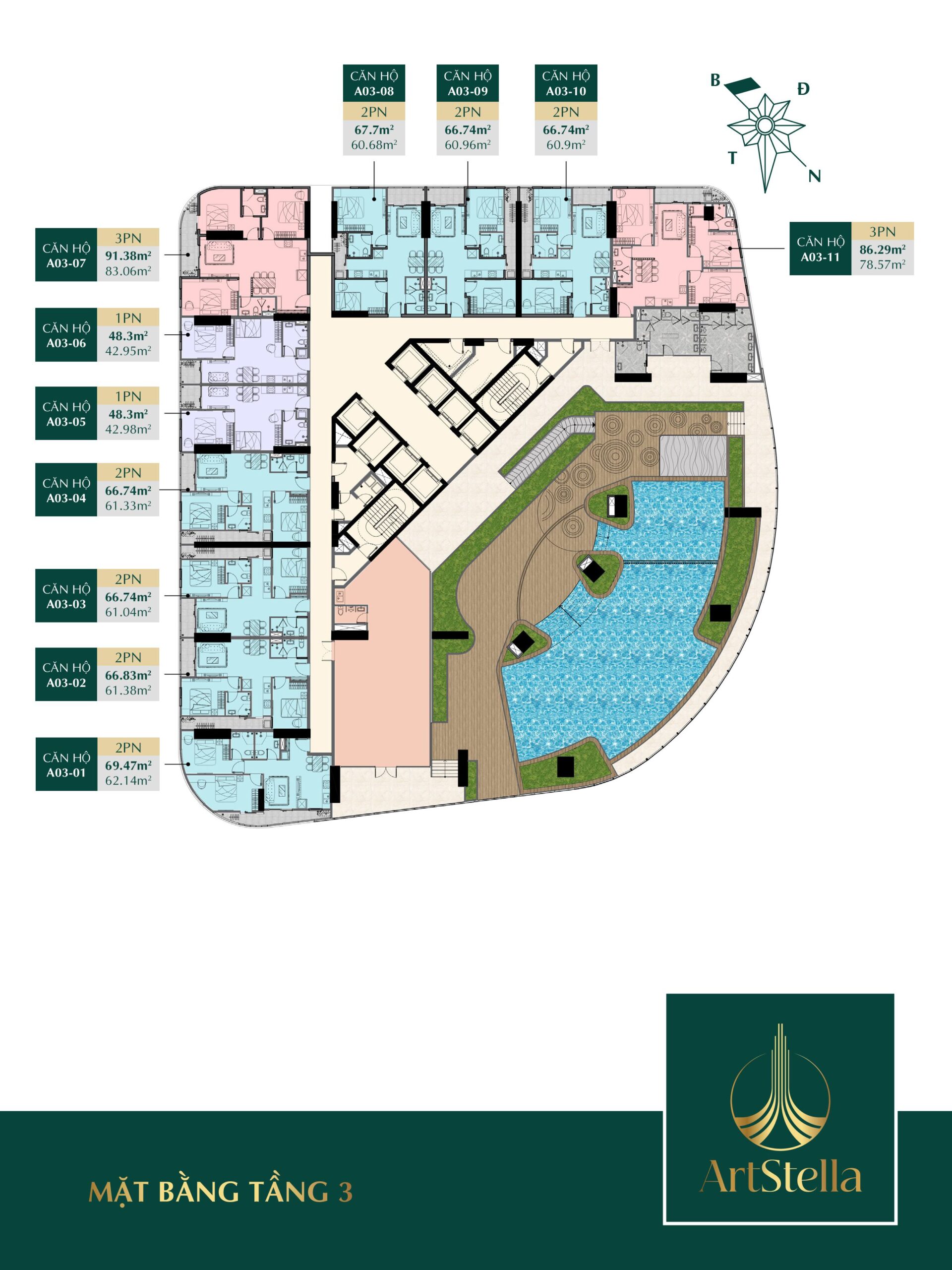 | 3 PN | 86-96 m² | Phù hợp cho gia đình 2 thế hệ trở lên |