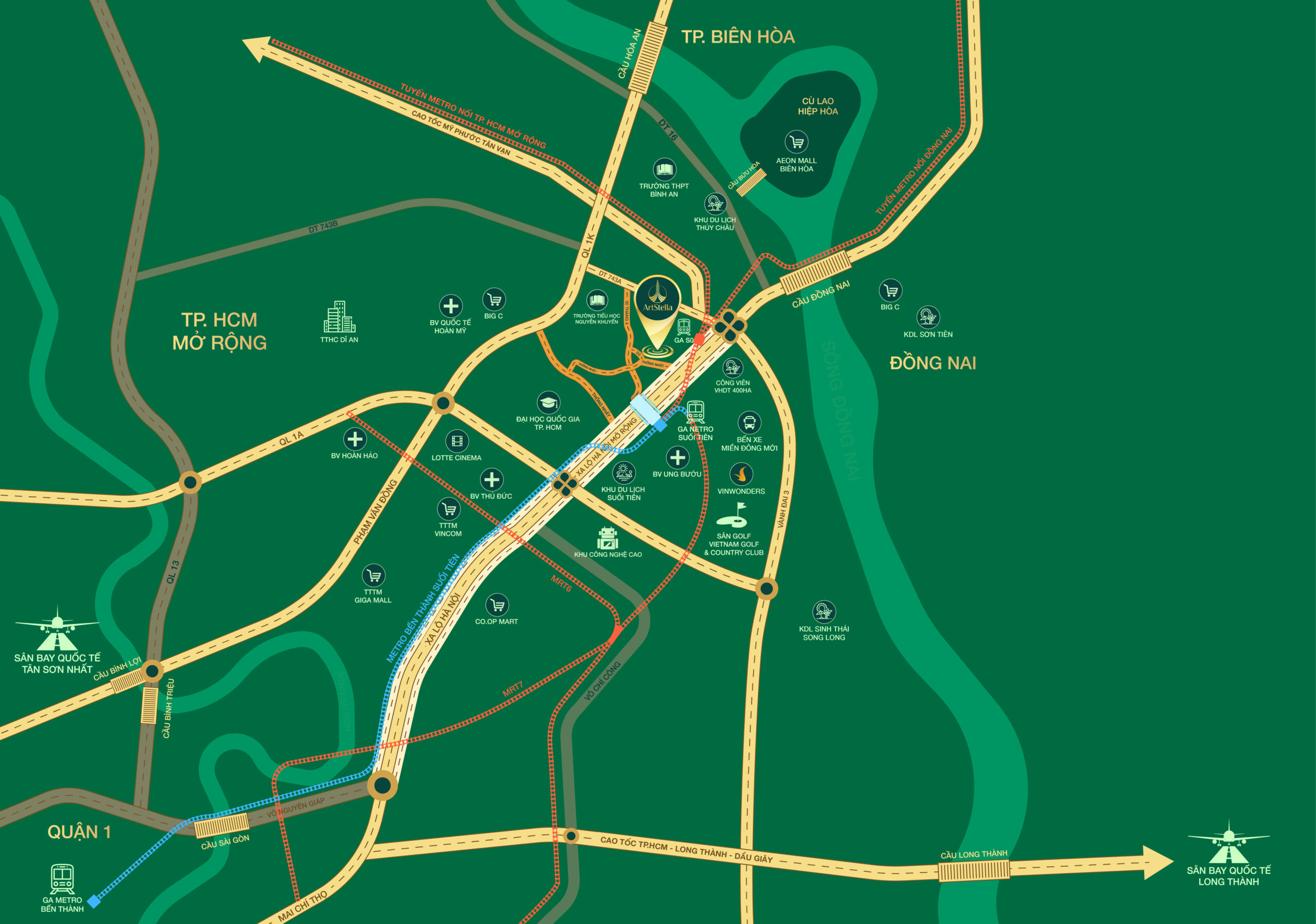 Đón đầu hạ tầng tương lai: Art Stella hưởng lợi từ các công trình lớn đang được triển khai như Vành đai 3, Vành đai 4 và tuyến Metro Bến Thành – Suối Tiên mở rộng, hứa hẹn mang lại sự bứt phá về giá trị.